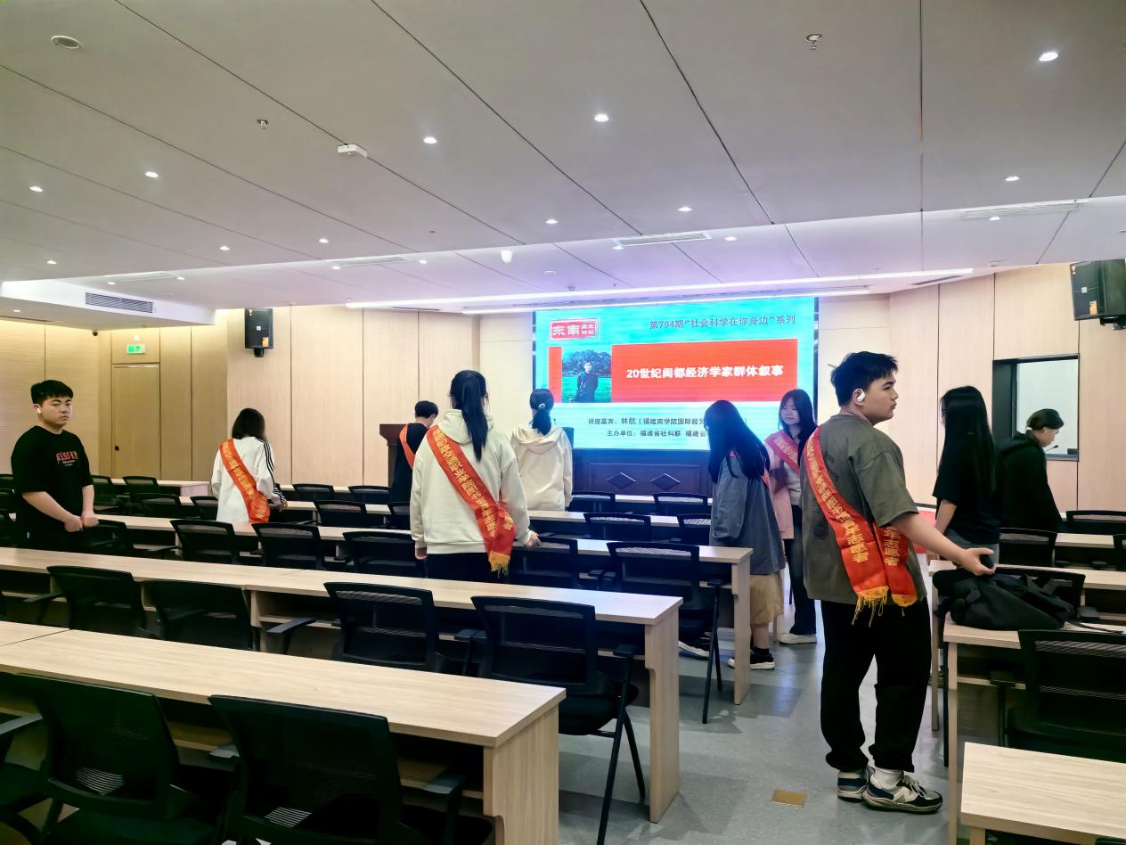 同學(xué)們?cè)谥驹阜?wù)的同時(shí),還觀摩了福建商學(xué)院國(guó)際經(jīng)貿(mào)學(xué)院副教授、博士、福建商學(xué)院閩商研究中心特約研究員林航作“20世紀(jì)閩都經(jīng)濟(jì)學(xué)家群體敘事”的專題講座。講座講述的是以“船政人物”嚴(yán)復(fù)為代表的閩都經(jīng)濟(jì)學(xué)家發(fā)揚(yáng)斗爭(zhēng)精神,賡續(xù)閩學(xué)基因,對(duì)舶來(lái)經(jīng)濟(jì)學(xué)說(shuō)中國(guó)化的探索歷程綿延百年,為中國(guó)經(jīng)濟(jì)學(xué)建設(shè)注入閩學(xué)精神,他們的開(kāi)創(chuàng)性貢獻(xiàn)值得銘記和緬懷。在講座最后的問(wèn)答互動(dòng)環(huán)節(jié)中,林航副教授親切熱情、娓娓道來(lái)地回答了同學(xué)們關(guān)注的問(wèn)題。