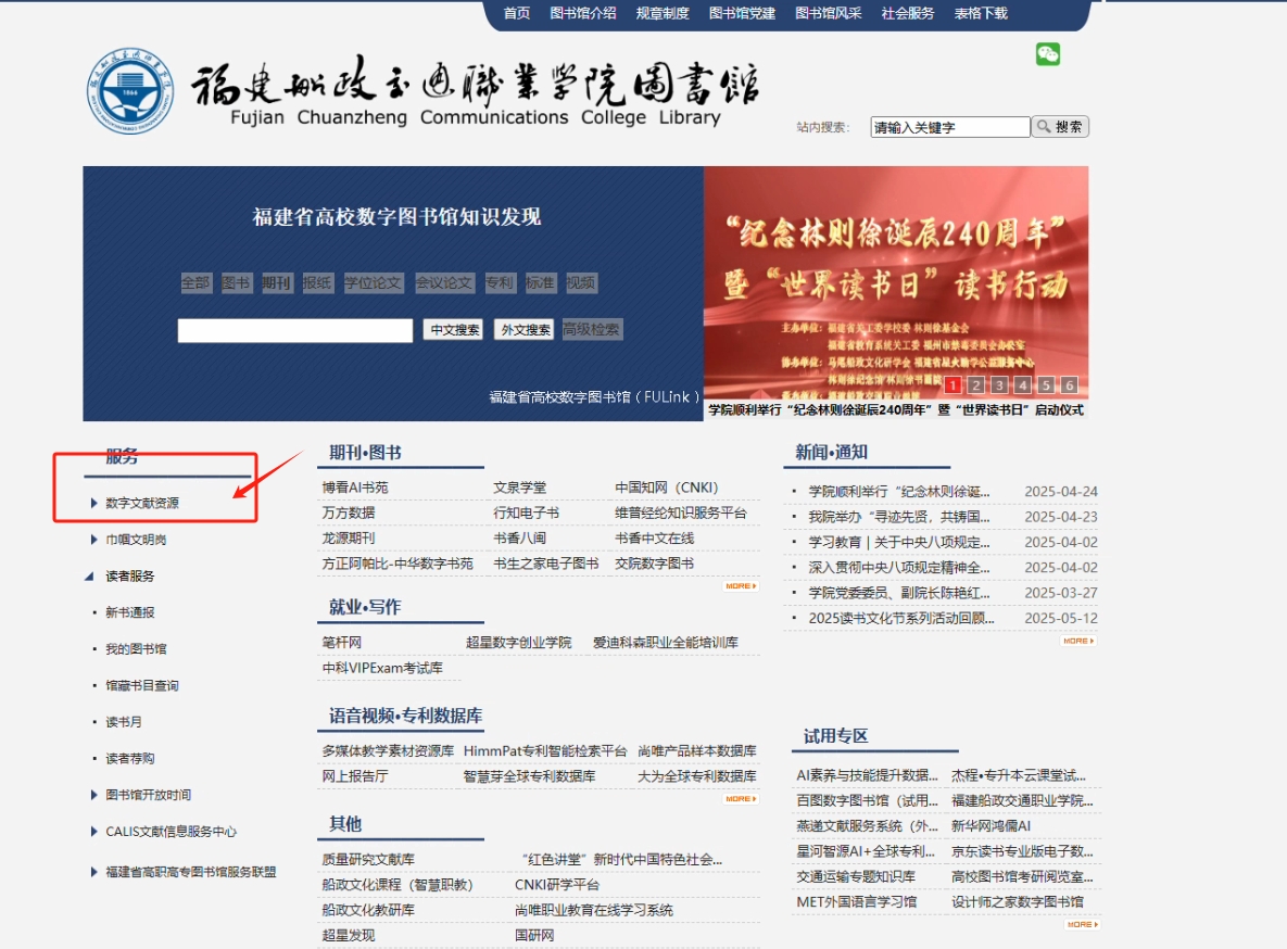 方法二:通過(guò)圖書(shū)館網(wǎng)站進(jìn)入數(shù)字文獻(xiàn)資源一站式訪問(wèn)平臺(tái)。