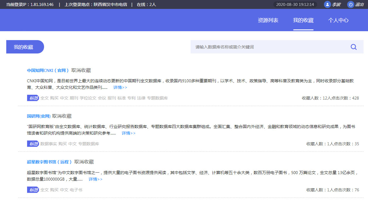 在登陸后的電子資源界面里我們能夠看到圖書(shū)館已對(duì)我們開(kāi)放的電子資源,在點(diǎn)擊相應(yīng)的電子資源名稱(chēng)后便能夠?yàn)g覽其中的內(nèi)容了、經(jīng)常使用的可以收藏起來(lái),方便下次使用。