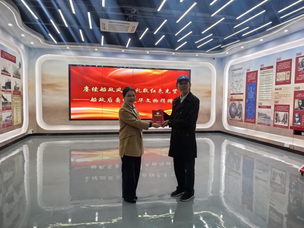 講座結(jié)束后,葉延華向?qū)W校無償捐贈6件珍貴的葉可鈺遺物,包括海軍制服配件、黨費(fèi)證及工作筆記等,陳艷紅代表學(xué)院接受捐贈,并向葉延華先生致以由衷敬意與誠摯感謝。隨后,陳艷紅為葉延華頒授捐贈證書,雙方共同為展覽剪彩,正式拉開“紅色船政人”系列展覽的序幕。