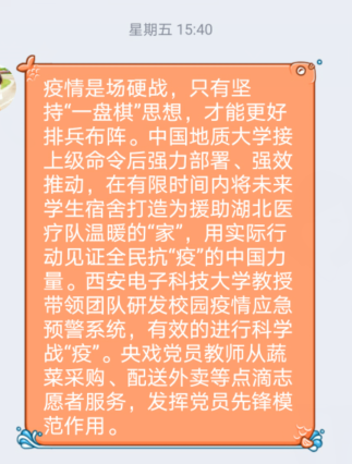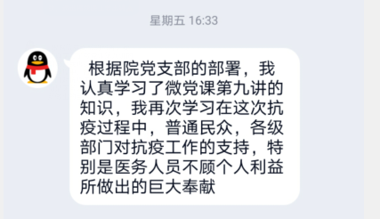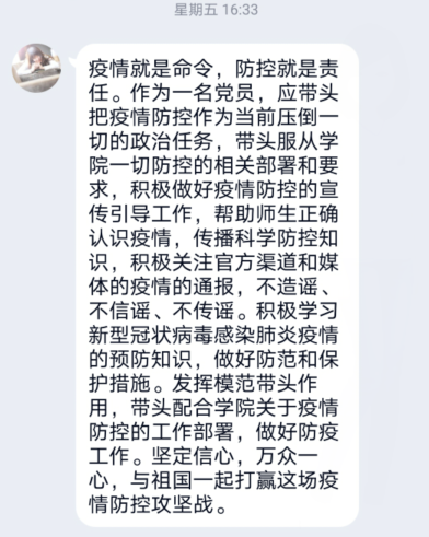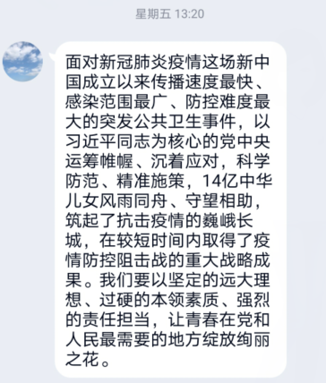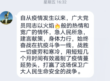 通過觀看微黨課,大家表示,在當前常態(tài)化疫情防控下,學院廣大師生黨員要始終繃緊弦、守好責、勇?lián)?,讓黨旗始終飄揚在疫情防控和立德樹人事業(yè)發(fā)展全過程。黨員同志們也更加感受到在這場沒有硝煙的戰(zhàn)役中,黨中央運籌帷幄、沉著應對,高校黨員沖鋒在第一線、戰(zhàn)斗在最前沿,匯聚起共同抗疫的磅礴偉力,集中體現(xiàn)了中國力量、中國精神、中國效率。