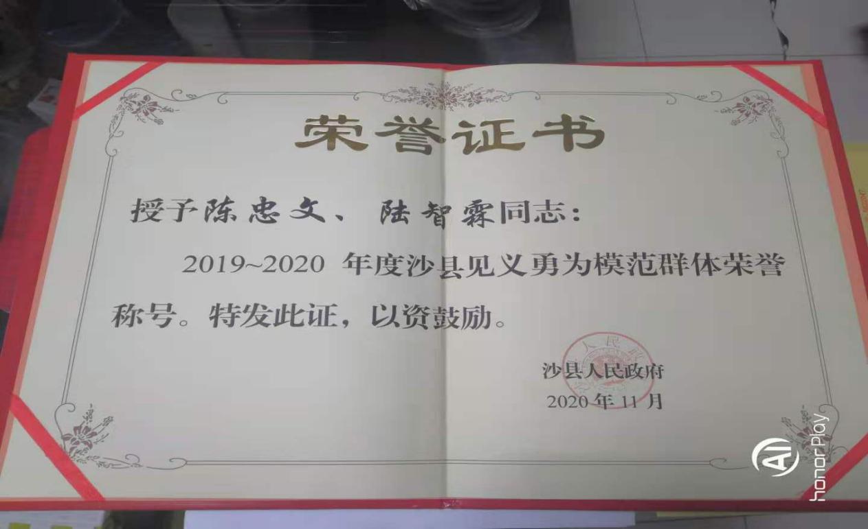陳忠文見(jiàn)義勇為榮譽(yù)證書(shū)