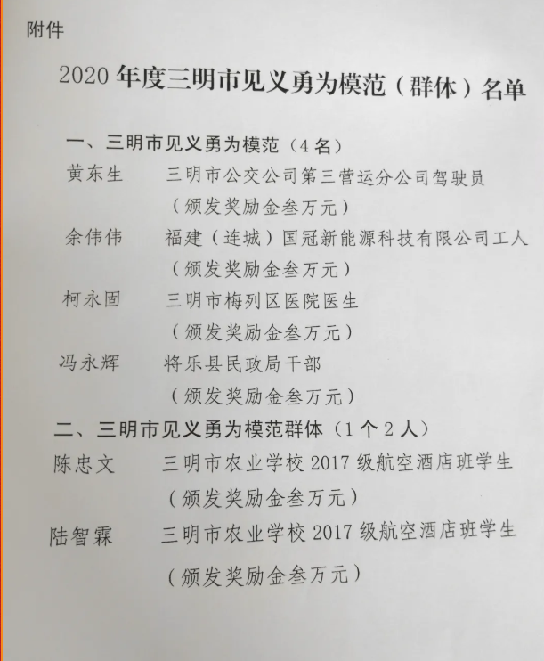 陳忠文和陸智霖勇制歹徒的英勇行為受到當(dāng)?shù)刭潛P(yáng),陳忠文和陸智霖同學(xué)被評(píng)為“2020年度三明市見(jiàn)義勇為模范群體”。他們受邀參加了2019-2020年度見(jiàn)義勇為表彰大會(huì),《三明農(nóng)校青年之聲》對(duì)他們的事跡進(jìn)行了報(bào)道。