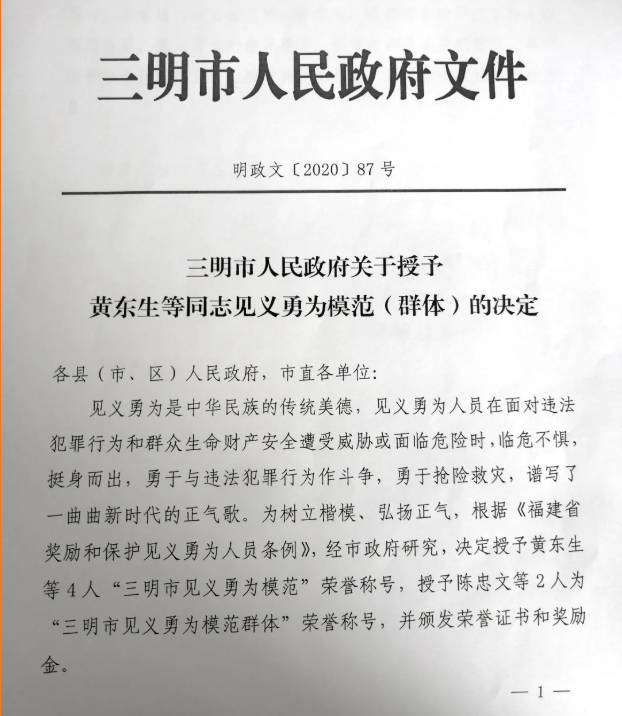 2019年10月11日,沙縣某山莊發(fā)生傷人事件,陳忠文和陸智霖不顧個(gè)人安危,全力搜尋并阻止企圖逃跑的歹徒,陳忠文腹部被打傷,陸智霖手臂被劃破,用盡力氣共制歹徒,直至警車(chē)到達(dá)現(xiàn)場(chǎng)。危急關(guān)頭,他們挺身而出,面對(duì)窮兇極惡的歹徒,他們不懼危險(xiǎn),用沉著冷靜和堅(jiān)毅勇敢詮釋了什么是英勇無(wú)畏,他們用實(shí)際行動(dòng)保護(hù)了人民群眾的安全,弘揚(yáng)社會(huì)正能量。