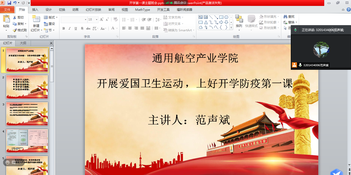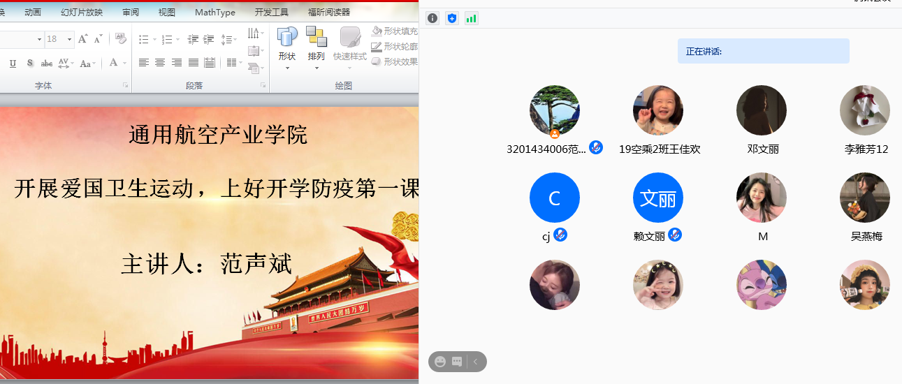 為大力開展新時代校園愛國衛(wèi)生運(yùn)動,弘揚(yáng)新時代偉大抗疫精,進(jìn)一步加強(qiáng)新冠肺炎防護(hù)知識的培訓(xùn)和宣傳教育,增強(qiáng)我院學(xué)生防護(hù)意識、提升科學(xué)防疫能力,以充分而有序的準(zhǔn)備迎接秋季學(xué)期復(fù)學(xué),按照學(xué)校秋季開學(xué)的工作要求,通用航空產(chǎn)業(yè)學(xué)院分別于8月7日、8月9日召開線上、線下“開學(xué)第一課”,由輔導(dǎo)員范聲斌,班主任陳瑞娟、陳巧玲主持。