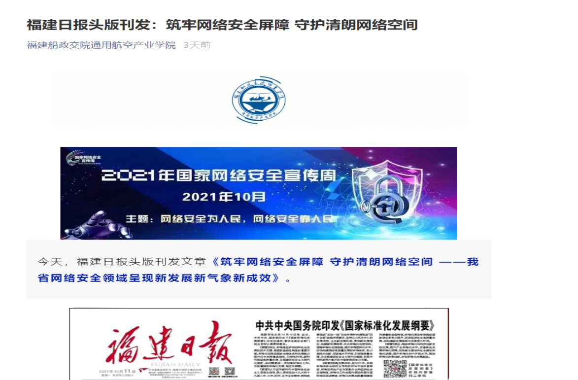 在2021年國(guó)家網(wǎng)絡(luò)安全宣傳周期間,通航空產(chǎn)業(yè)學(xué)院開展了一系列線上線下活動(dòng),引導(dǎo)師生養(yǎng)成依法上網(wǎng)、文明上網(wǎng)、安全上網(wǎng)的良好習(xí)慣。二是轉(zhuǎn)載官方網(wǎng)站宣傳網(wǎng)絡(luò)安全小視頻,提醒師生保護(hù)個(gè)人信息,謹(jǐn)防被騙;三是全方位動(dòng)員師生自覺成為維護(hù)國(guó)家網(wǎng)絡(luò)安全的重要力量,爭(zhēng)做網(wǎng)絡(luò)安全的踐行者、參與者、推動(dòng)者、宣傳者,為共享共建清朗、便捷的網(wǎng)絡(luò)空間,共同維護(hù)國(guó)家網(wǎng)絡(luò)安全營(yíng)造良好的氛圍。