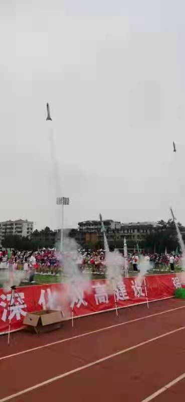 十枚易拉罐制作的模型火箭與一枚長征二號仿真火箭騰空而起