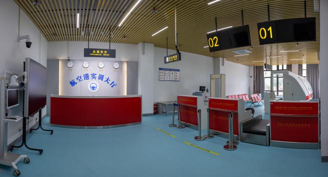 “空中乘務”實訓中心,按照民航總局四級乘務員教學培訓標準,建設(shè)有模擬客艙、撤離平臺、機場地面服務、形體訓練室等。