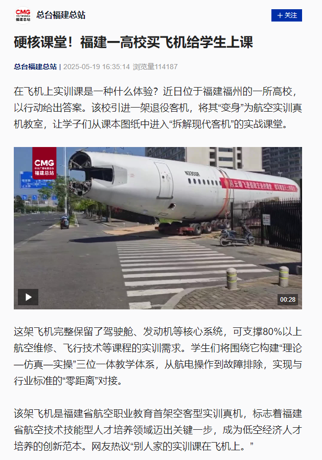 該架飛機是福建省航空職業(yè)教育首架空客型實訓真機,標志著福建省航空技術技能型人才培養(yǎng)領域邁出關鍵一步,成為低空經(jīng)濟人才培養(yǎng)的創(chuàng)新范本。網(wǎng)友熱議“別人家的實訓課在飛機上。”