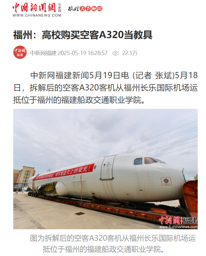 據(jù)了解,該架飛機是福建省航空職業(yè)教育首架空客型實訓真機,待完成組裝后,用于教學實訓和社會培訓。(完)