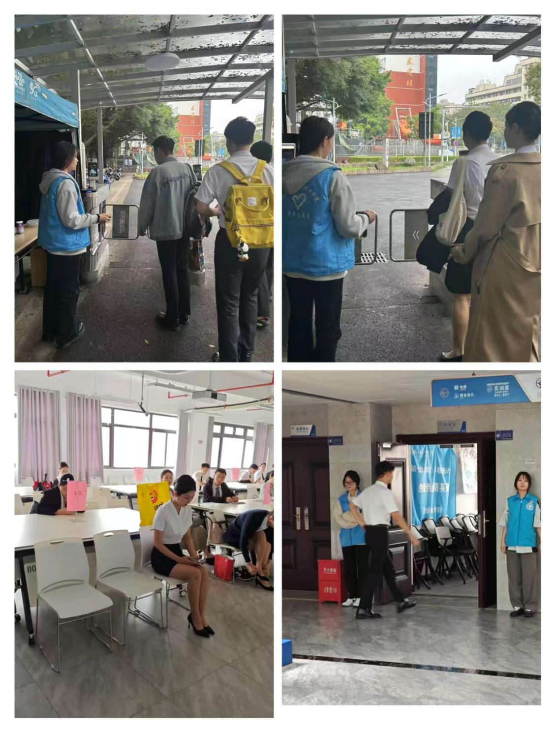 面試當(dāng)天,志愿者們?cè)缭绲竭_(dá)現(xiàn)場(chǎng)集合,為其進(jìn)行分組。一組于校門口負(fù)責(zé)人員核驗(yàn),為無校內(nèi)人臉信息的面試人員幫助其刷臉,讓其進(jìn)入,同時(shí)嚴(yán)格排查非面試人員,禁止其進(jìn)入校園;另一組在面試樓層,引導(dǎo)已通過核驗(yàn)的面試人員前往指定區(qū)域,并協(xié)助面試官準(zhǔn)備材料、調(diào)試設(shè)備,保障面試全程高效、安全、有序。