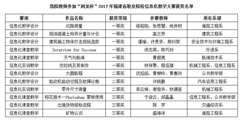 日前,從“網(wǎng)龍杯”2017年福建省職業(yè)院校信息化教學(xué)大賽上傳來喜訊,經(jīng)網(wǎng)絡(luò)初評(píng)和現(xiàn)場(chǎng)決賽,我院參賽教師取得一等獎(jiǎng)作品6件、二等獎(jiǎng)作品3件、三等獎(jiǎng)作品3件的優(yōu)異成績(jī),一等獎(jiǎng)作品獲獎(jiǎng)數(shù)和參賽作品獲獎(jiǎng)總成績(jī)均位居全省高職院校首位。