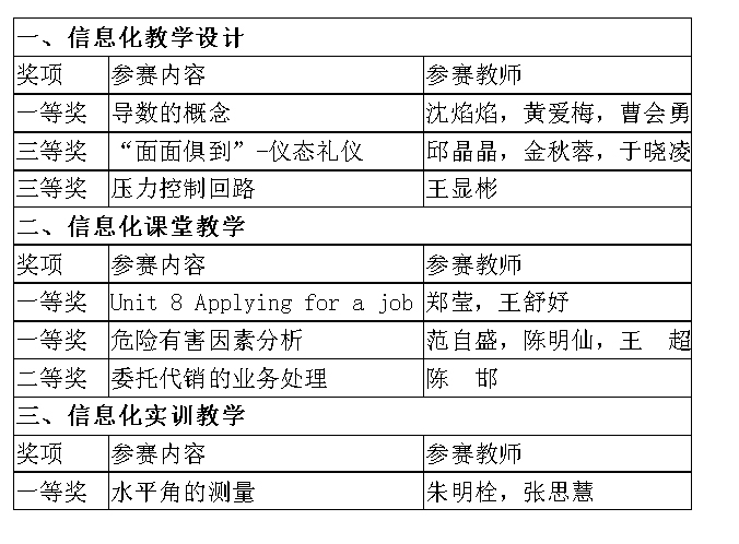 根據(jù)《福建省教育廳關(guān)于舉辦2016年福建省職業(yè)院校信息化教學(xué)大賽的通知》(閩教職成〔2016〕51號(hào)),全省職業(yè)院校信息化教學(xué)大賽于7月在福州舉行。我院參賽的《導(dǎo)數(shù)的概念》等7門課程獲得了4項(xiàng)一等獎(jiǎng)、1項(xiàng)二等獎(jiǎng)、2項(xiàng)三等獎(jiǎng)的成績。