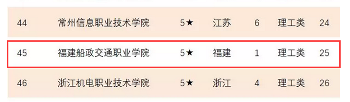 2019年3月28日,第二屆全國高職高專院?!皟?yōu)質(zhì)?!苯ㄔO(shè)與評(píng)價(jià)論壇正式發(fā)布了2019年中國高職高專院校競爭力排行榜,福建船政交通職業(yè)學(xué)院獲得5星評(píng)價(jià),全國排名第45位,福建省第1。