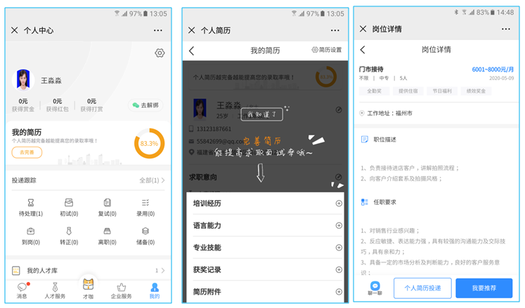 點(diǎn)“我的簡(jiǎn)歷”→填寫具體信息→進(jìn)行在線個(gè)人簡(jiǎn)歷投遞