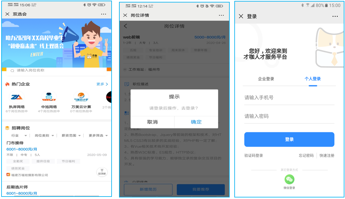 通過審核企業(yè)在“才咖”人才服務(wù)平臺(tái)發(fā)布崗位信息,即可參與招聘會(huì),同時(shí)可報(bào)名參加企業(yè)空中宣講會(huì);