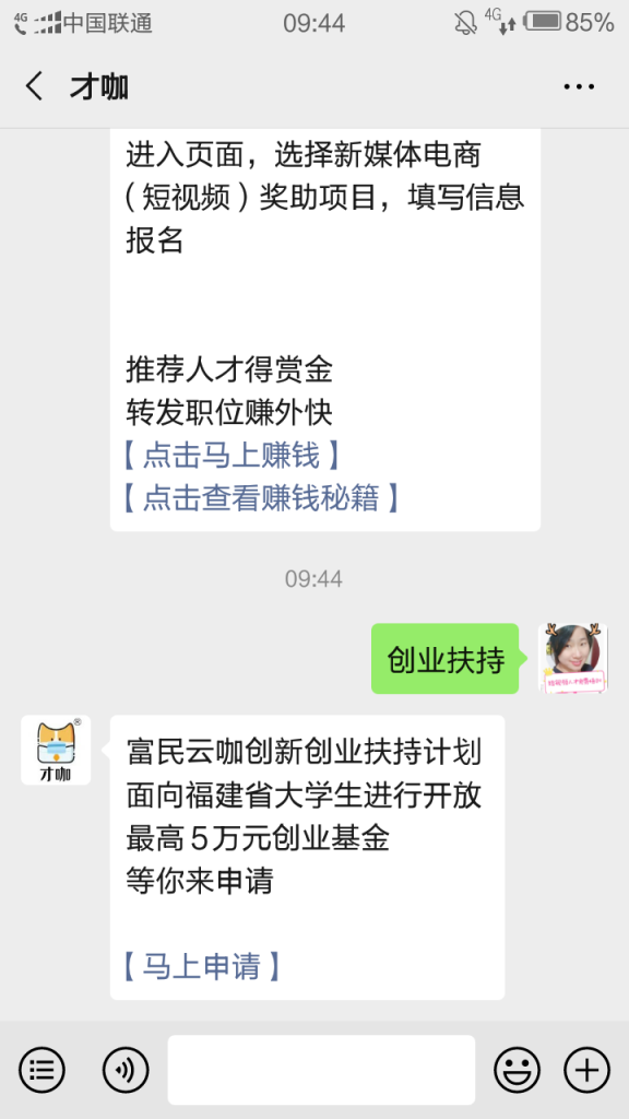 (2)申請(qǐng)方式:關(guān)注“才咖”公眾號(hào)(微信號(hào):caika007),發(fā)送關(guān)鍵字“創(chuàng)業(yè)扶持”,點(diǎn)“馬上申請(qǐng)”,提交創(chuàng)業(yè)項(xiàng)目申請(qǐng)。