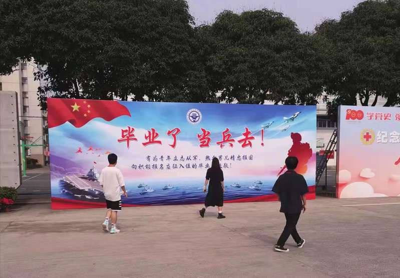 在校園主干道擺放巨幅宣傳牌,公布本次征兵主要政策、報(bào)名流程等,用激情四射的圖文號召大家“畢業(yè)了,當(dāng)兵去!”同樣的內(nèi)容制作成宣傳冊,通過微信公眾號、班級微信群、QQ群等多種形式、渠道傳遞給同學(xué)們。征兵工作站開通熱線電話,隨時接受咨詢。