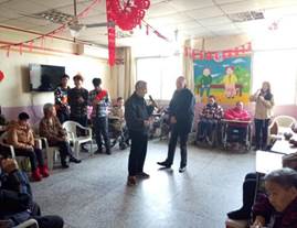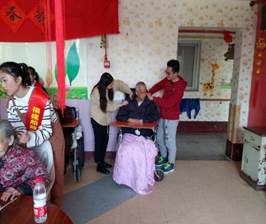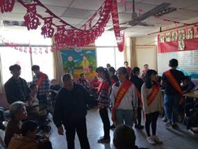 在敬老院里,志愿者們受到了敬老院領(lǐng)導(dǎo)和老人們的熱情歡迎。本次活動(dòng)大體將志愿者分為兩組,分別去一樓大廳和二樓大廳與老人們聊天解悶。志愿者們?yōu)槔先怂蜕狭宋繂柶?,這一份份慰問品蘊(yùn)涵著志愿者們對(duì)老人們的深深敬意與祝福,大家又親切地圍在老人們的身邊陪他們聊聊天,為他們捶捶背、捏捏肩,為老人們表演了一系列精心的節(jié)目。
