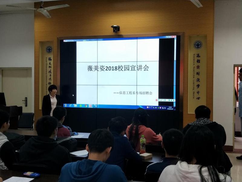 信息工程系于2018年11月2日中午12:30至下午3:00在北區(qū)2號樓2-1教室舉辦了信息工程系畢業(yè)生招聘宣講會,薇美姿(舒克)實(shí)業(yè)有限公司宣講人--林小姐為同學(xué)做了簡單的介紹,薇美姿是集研發(fā)、生產(chǎn)和銷售于一體的創(chuàng)新性高科技企業(yè)。旗下?lián)碛袃纱罂谇蛔o(hù)理品牌舒客和舒客寶貝。產(chǎn)品遍布全國各省市,并已全線進(jìn)入沃爾瑪、家樂福、歐尚、易初蓮花、吉之島、大潤發(fā)等國際、國內(nèi)大型連鎖賣場,實(shí)現(xiàn)了KA賣場、大型百貨店、日化專賣店、藥業(yè)連鎖店及電子商務(wù)的全方位覆蓋。