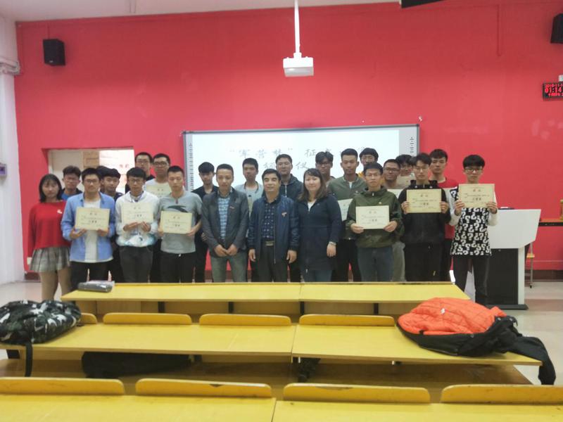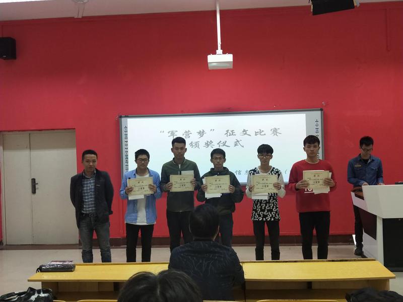 頒獎儀式開始,主持人介紹了“軍營夢”征文比賽的得獎情況和評選活動情況,并向現(xiàn)場參加頒獎儀式的同學介紹了到場老師。隨后信息系系書記孫基老師發(fā)言宣布并恭喜得獎同學,然后由信息系系書記孫基老師為獲得一等獎的同學頒獎并發(fā)放獎品及獎狀,征兵負責人唐曉軍老師為獲得二等獎的同學頒獎并發(fā)放獎品及獎狀,“軍營夢”征文比賽負責人2017級輔導員黃華梅老師為獲得三等獎的同學頒獎并發(fā)放獎品及獎狀,頒發(fā)優(yōu)秀獎。隨后一起合影留戀記錄這光榮的一刻。