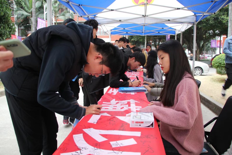 整場(chǎng)活動(dòng)由我系學(xué)生會(huì)成員共同參與舉辦。活動(dòng)伊始,各班級(jí)學(xué)生排整隊(duì)伍嚴(yán)肅有序入場(chǎng)。同學(xué)們?cè)?/span>以誠(chéng)為筆、用信作答、以信為基、輔之以誠(chéng)的橫幅上熱誠(chéng)地簽下自己的名字。