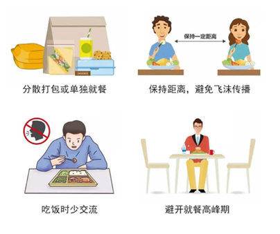 5.前往食堂就餐時(shí)應(yīng)錯峰就餐,避開就餐高峰期,排隊(duì)時(shí)保持前后一米左右的距離,吃飯前應(yīng)先洗手,就餐時(shí)時(shí)少交流,保持距離分散入座,避免飛沫傳播。