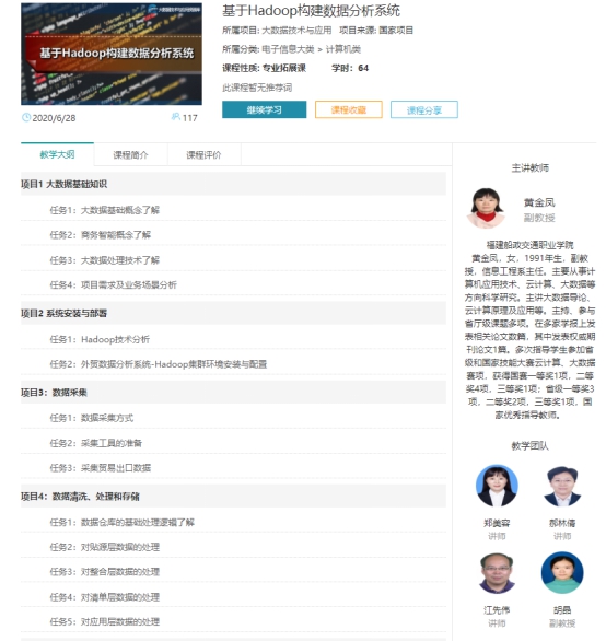 該課程由信息工程系黃金鳳老師帶領(lǐng)的大數(shù)據(jù)教師團(tuán)隊(duì),主要成員有鄭美容、胡晶、江先偉、郝林倩四位教師,通過近一年的努力,基本完成了該課程資源的建設(shè),課程現(xiàn)已在智慧職教平臺(tái)(https://www.icve.com.cn/portal_new/courseinfo/courseinfo.html?courseid=ujs3aokriqpfj2pvrhaufg)發(fā)布成功。目前基于該課程的配套雙元制教材《大數(shù)據(jù)分析與應(yīng)用實(shí)戰(zhàn)》正在修訂階段,預(yù)計(jì)2020年9月可以出版。