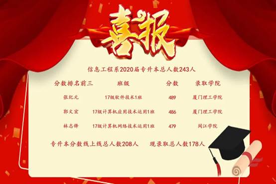其中17級軟件技術(shù)1班張紀元同學(xué),專升本分數(shù)489分被廈門理工學(xué)院錄取;17級計算機技術(shù)運用1班郭文宏同學(xué),專升本分數(shù)486分被廈門理工學(xué)院錄取;17級計算機網(wǎng)絡(luò)技術(shù)運用1班林志鋒同學(xué),專升本分數(shù)479分被閩江學(xué)院錄取。捷報傳來,我院師生歡欣鼓舞!