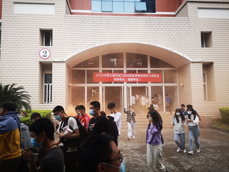 12時30分,逃生演練在北區(qū)學(xué)生宿舍6號樓及北區(qū)2號、8號教學(xué)樓拉開序幕,為真實模擬演習(xí)場景,工作人員在各樓前點燃煙霧彈,900多名師生由工作人員帶領(lǐng)彎腰,捂口掩鼻,沿著指定的逃生通道和樓梯口快速撤離到“安全地帶”北區(qū)籃球場。