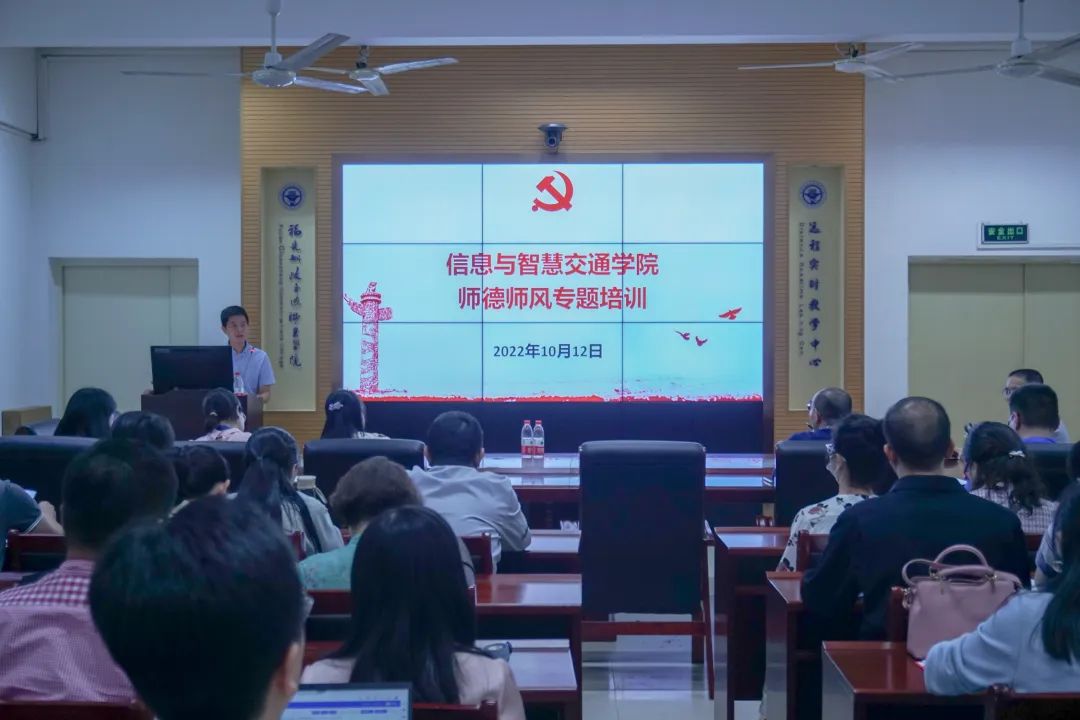 師德是教師最重要的素質(zhì),是教育之靈魂。為進(jìn)一步推進(jìn)我院師德師風(fēng)建設(shè)工作,打造作風(fēng)過(guò)硬、師德高尚的教師隊(duì)伍,樹(shù)立嚴(yán)格自律、愛(ài)崗敬業(yè)、為人師表的良好教師形象,10月12日,信息與智慧交通學(xué)院組織學(xué)院全體教職工于福道園自強(qiáng)樓2-1開(kāi)展師德師風(fēng)專題培訓(xùn)。本次培訓(xùn)由信息與智慧交通學(xué)院黨總支書(shū)記許友孝主持。