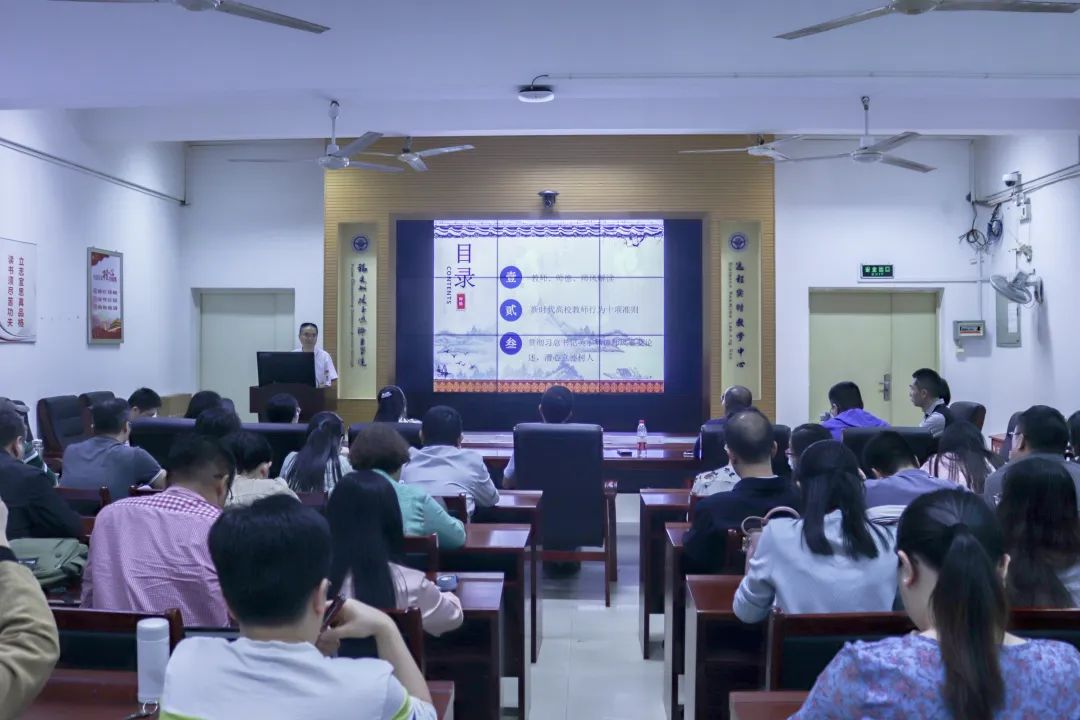 本次師德師風(fēng)專題培訓(xùn),我院邀請(qǐng)了現(xiàn)任福建農(nóng)林大學(xué)食品科學(xué)學(xué)院黨委書(shū)記、副教授蘇建涵,蘇教授從“教師、師德、師風(fēng)解讀”、“新時(shí)代高校教師行為十項(xiàng)準(zhǔn)則”、“貫徹習(xí)近平總書(shū)記關(guān)于師德師風(fēng)重要論述,潛心立德樹(shù)人”三個(gè)方面,詳細(xì)教授了新時(shí)代教師要如何做到“弘揚(yáng)高尚師德 潛心立德樹(shù)人”,引導(dǎo)全體教師結(jié)合自己的本職崗位,圍繞師德師風(fēng)建設(shè)進(jìn)行深度思考,認(rèn)識(shí)到教師職業(yè)道德的重要性。