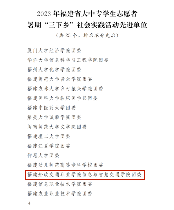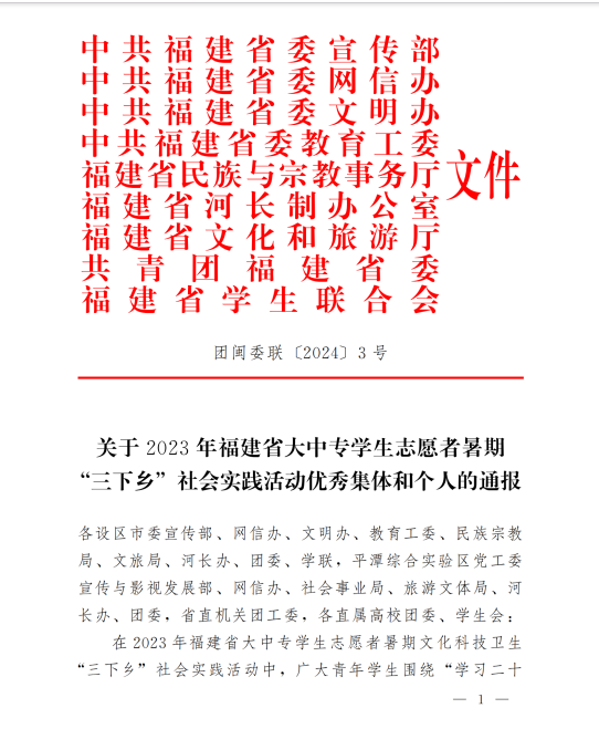 近日,在2023年福建省大中專學生志愿者暑期文化科技衛(wèi)生“三下鄉(xiāng)”社會實踐活動總結(jié)表彰中,我院榮獲2023年福建省大中專學生志愿者暑期“三下鄉(xiāng)”社會實踐活動先進單位。