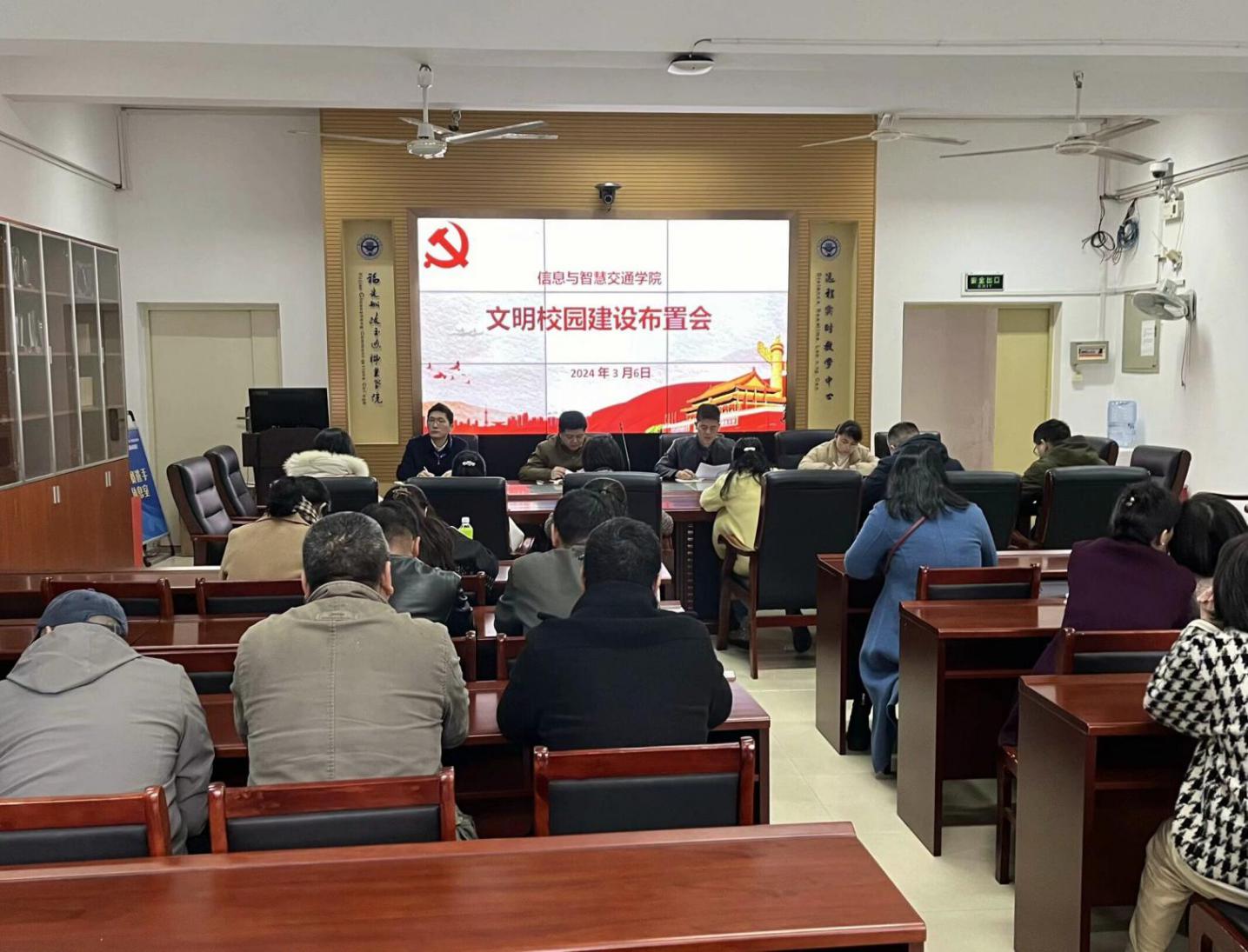 為進一步貫徹落實學(xué)校第三屆省級文明校園實地考察迎檢工作任務(wù)部署和工作要求,3月6日下午,信息與智慧交通學(xué)院在福道園自強樓2-1會議室召開文明校園建設(shè)布置會,部署安排近期重點工作。信息與智慧交通學(xué)院全體教職工參加會議。
