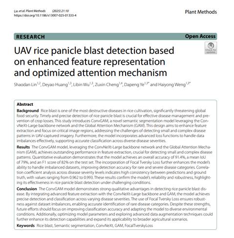 近日,福建農(nóng)林大學(xué)農(nóng)業(yè)人工智能中心與福建船政交通職業(yè)學(xué)院信息與智能交通學(xué)院的研究團(tuán)隊合作,成功開發(fā)了一種基于無人機(jī)圖像的高精度水稻穗瘟病檢測模型——ConvGAM。該研究成果已發(fā)表在《Plant Methods》期刊(JCR 1區(qū),SCI 2區(qū))上,題為《UAV rice panicle blast detection based on enhanced feature representation and optimized attention mechanism》。