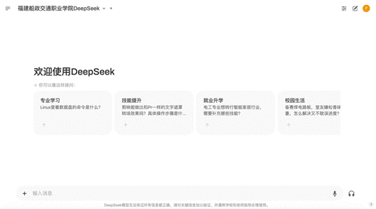 為更好地服務(wù)師生,支持利用人工智能技術(shù)輔助教學(xué)、實訓(xùn)和自主學(xué)習(xí),DeepSeek-R1模型的本地化部署并試運行上線,面向在校師生提供DeepSeek通用問答平臺服務(wù)。該平臺不僅為教師提供了高效的教學(xué)輔助工具,還為學(xué)生提供了智能化的學(xué)習(xí)體驗。