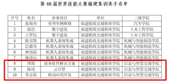近日,福建省人力資源和社會保障廳正式公布第48屆世界技能大賽福建省集訓(xùn)基地名單,我院云計算、移動應(yīng)用開發(fā)兩大項目基地成功入選。同時,我院三名優(yōu)秀選手憑借過硬技能實力,成功入圍本屆福建省集訓(xùn)隊。