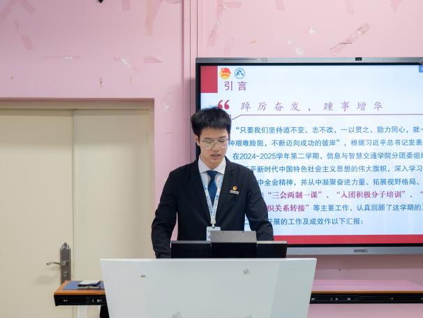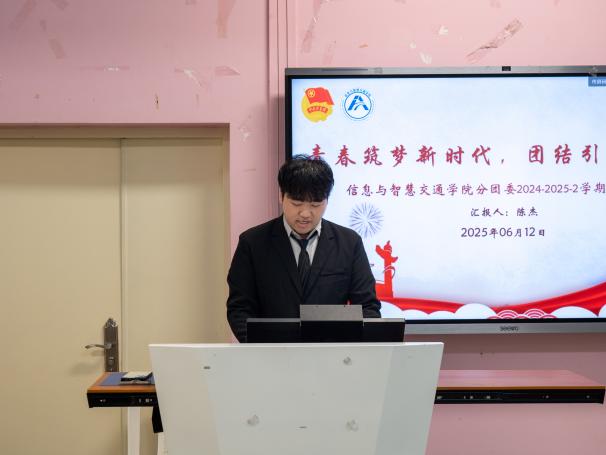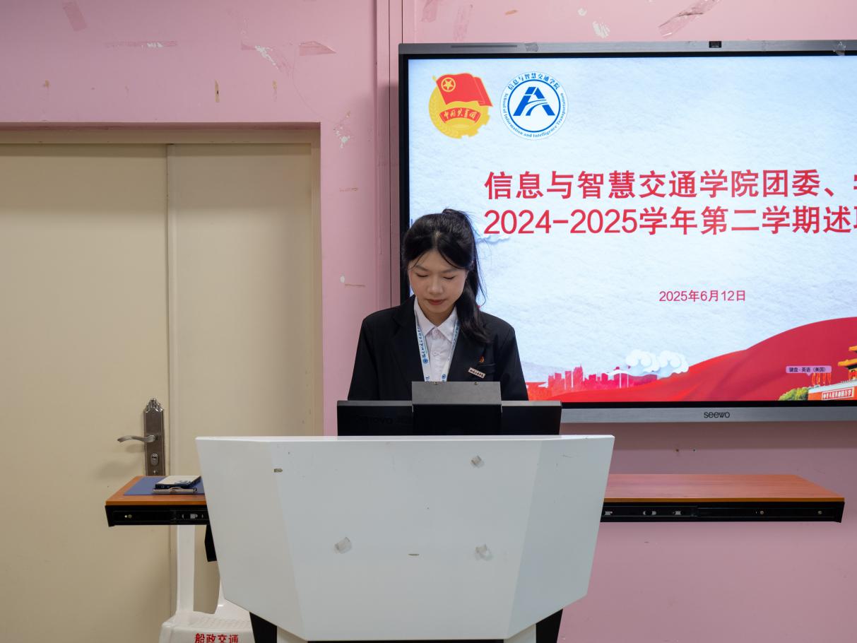 為總結(jié)2024-2025學(xué)年第二學(xué)期工作成效,凝聚團學(xué)組織發(fā)展動能,推動學(xué)生工作在新時代教育實踐中提質(zhì)增效,2025年6月12日,信息與智慧交通學(xué)院2024-2025-2學(xué)期兩委干部述職大會在福道園自強樓2-3教室舉行。學(xué)院分團委副書記沈晨晞、學(xué)院團組織學(xué)生干部、學(xué)院學(xué)生會工作人員及學(xué)生代表參加會議。會議由學(xué)院分團委兼職副書記(學(xué)生)朱翠琪主持。