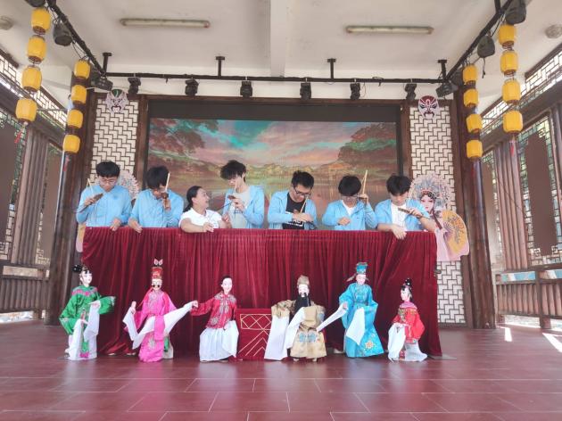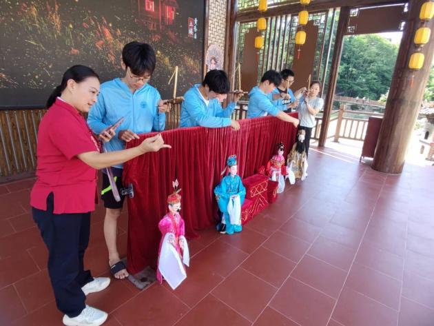暮色之中,傳承團(tuán)前往木偶戲戲臺(tái)學(xué)習(xí)提線木偶。在觀看了一場精彩的《拜壽》戲曲后,成員們躍躍欲試,開始對提線木偶技藝進(jìn)行初步嘗試。細(xì)繩纏繞指尖,輕拉慢放間,木偶仿佛被注入了生命,輕輕顫動(dòng)。成員們?nèi)褙炞ⅲ唤z不茍地模仿師傅的動(dòng)作,盡管手法尚顯生疏,卻難掩對這門古老藝術(shù)的敬畏與熱愛。在這靜謐與靈動(dòng)交織的瞬間,傳統(tǒng)技藝的種子悄然播撒心田,激發(fā)起成員們傳承與創(chuàng)新的責(zé)任感。