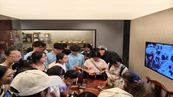 成員們圍攏在木偶工作臺旁,老匠人的刻刀起落間,木屑紛飛,他們從中感知木偶頭“三分面七分神”的奧秘。展柜里,閩南民居模型的榫卯結(jié)構(gòu)吸引著傳承團(tuán)成員,他們反復(fù)端詳。聆聽非遺故事,觸摸技藝溫度,傳承團(tuán)心中滿是對閩藝的震撼與傳承熱忱。