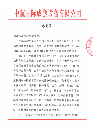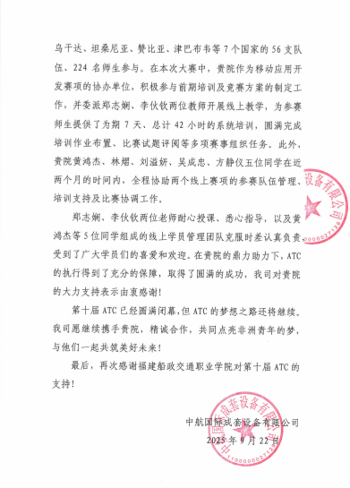 近日,由中航國際成套設(shè)備有限公司、肯尼亞教育部和中國教育國際交流協(xié)會聯(lián)合主辦的第十屆非洲職業(yè)技能挑戰(zhàn)賽(Africa Tech Challenge,簡稱“ATC”)圓滿落幕。我院信息與智慧交通學(xué)院師生團隊全程護航移動應(yīng)用開發(fā)賽項,以專業(yè)師資精準(zhǔn)授課、青年志愿暖心服務(wù),圓滿完成了線上培訓(xùn)與技術(shù)保障任務(wù),并獲主辦單位中航國際成套設(shè)備有限公司專函致謝。