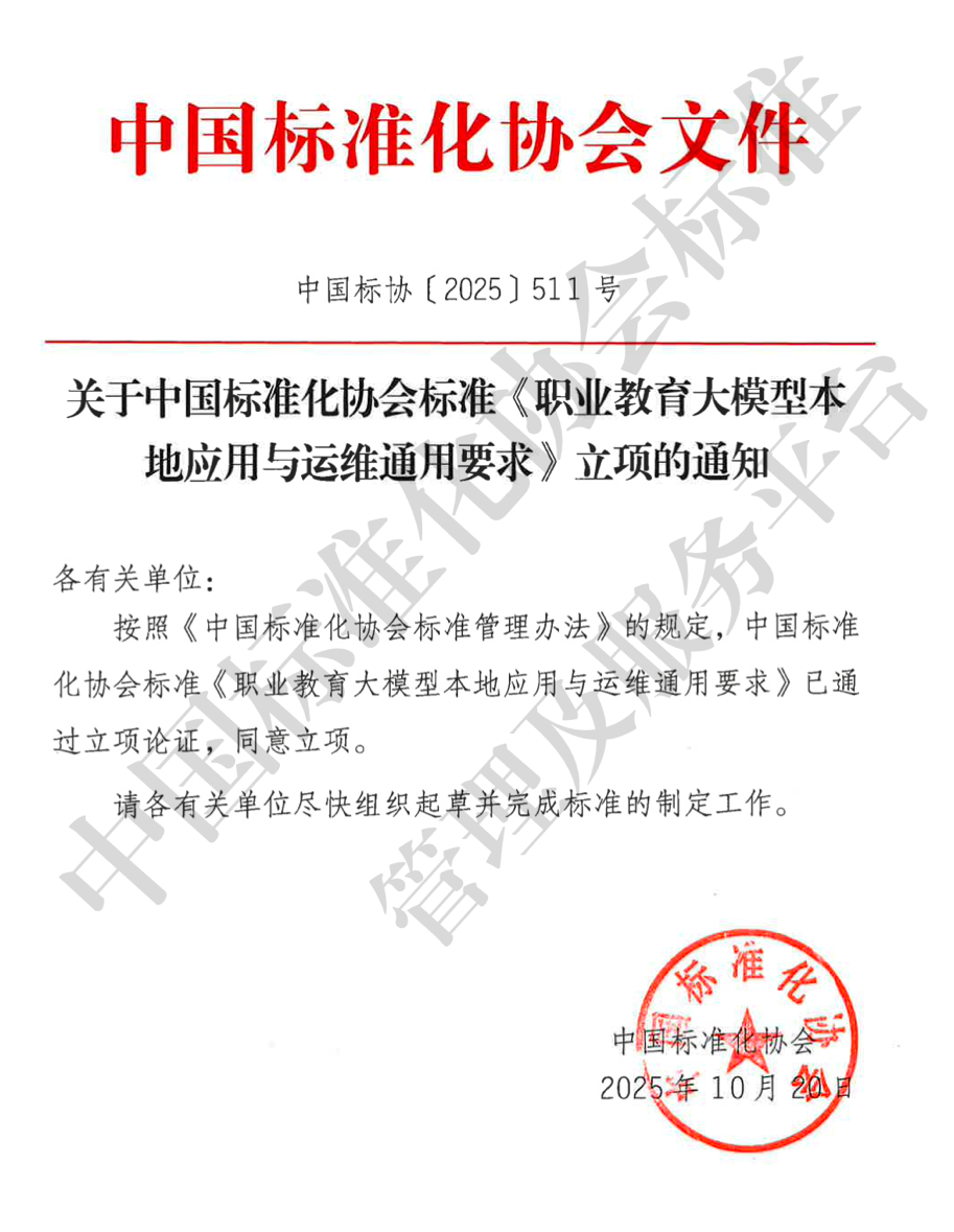 近日,由我院參與編制的團(tuán)體標(biāo)準(zhǔn)《職業(yè)教育大模型本地應(yīng)用與運(yùn)維通用要求》已正式通過中國標(biāo)準(zhǔn)化協(xié)會(huì)立項(xiàng),標(biāo)志著我院在人工智能與職業(yè)教育深度融合方向的標(biāo)準(zhǔn)化工作取得重要階段性成果。