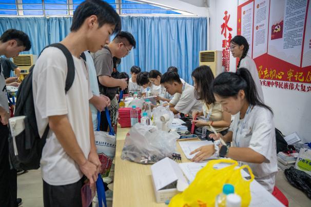 現(xiàn)場(chǎng)百余名校院兩級(jí)志愿者身著統(tǒng)一服裝,協(xié)助新生完成身份核驗(yàn)、宿舍引導(dǎo)等服務(wù),耐心解答新生關(guān)于學(xué)業(yè)規(guī)劃、生活服務(wù)等方面的疑問。
