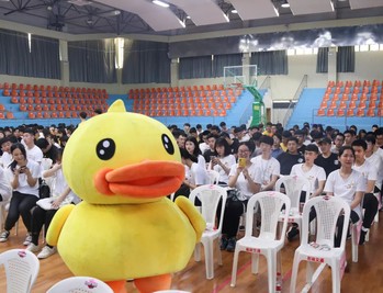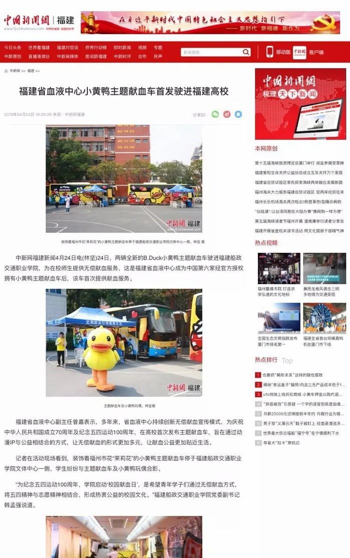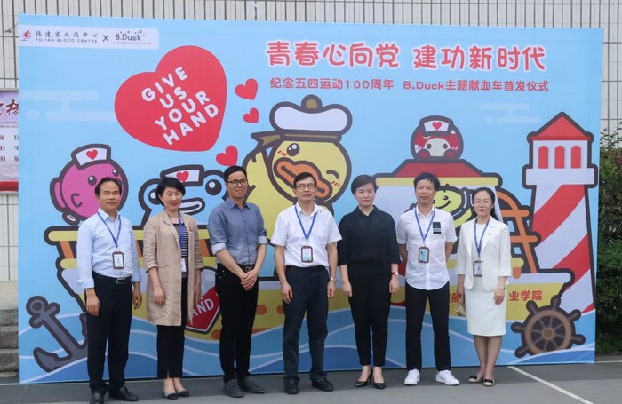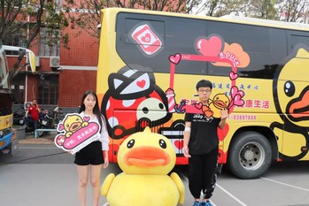 4月24日,兩輛全新布置的B.Duck小黃鴨主題獻血車開進我校,開啟“青春心向黨·建功新時代”愛心獻血活動。