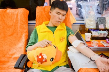 同學(xué)們被小黃鴨獻血車萌萌的外表吸引,紛紛填表登記,上車捋袖獻血。