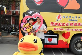 ▲裝飾著福州市花“茉莉花”的小黃鴨主題獻血車停于校文體中心旁