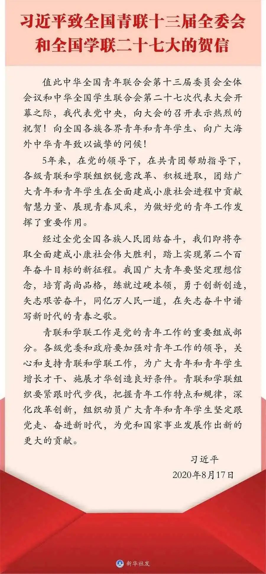 中華全國(guó)學(xué)生聯(lián)合會(huì)第二十七次代表大會(huì)在2020年8月17日上午在北京開幕。中共中央總書記、國(guó)家主席習(xí)近平發(fā)來賀信,代表黨中央,向大會(huì)的召開表示熱烈的祝賀,向全國(guó)各界青年和青年學(xué)生、向廣大海外中華青年致以誠(chéng)摯的問候。