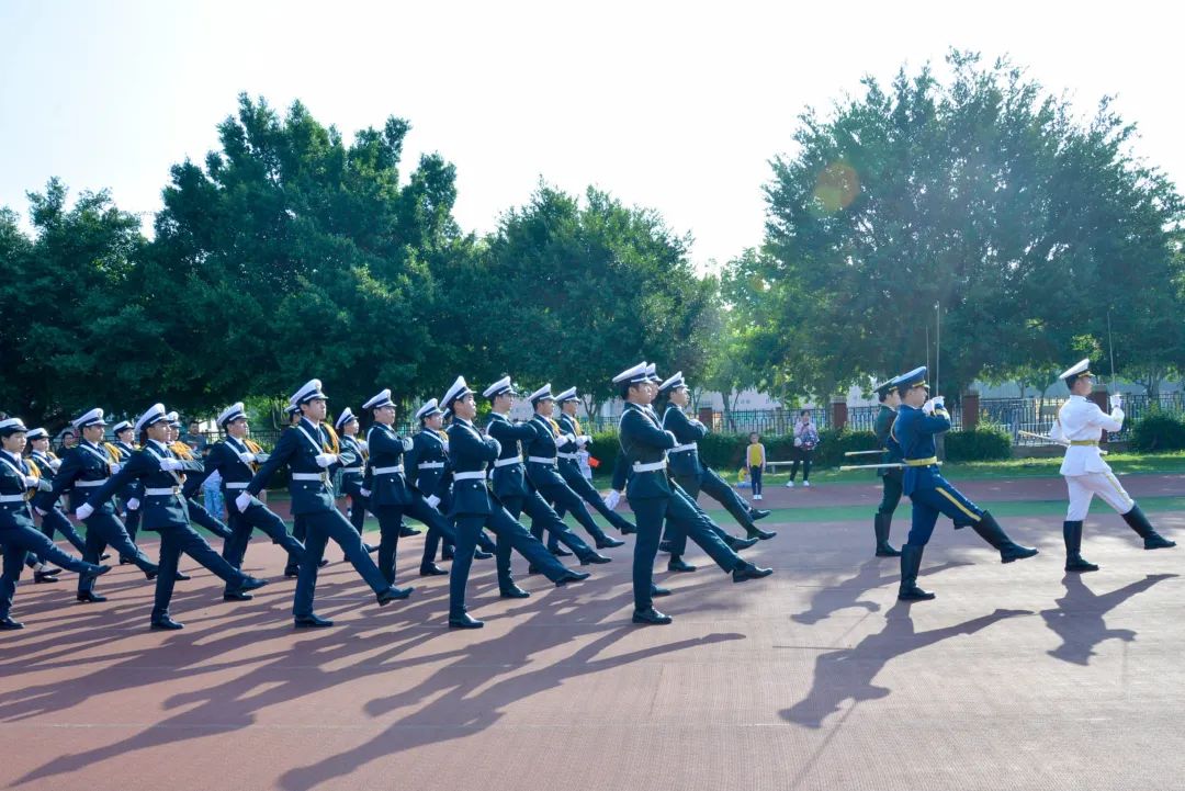 上午8:00,國(guó)旗護(hù)衛(wèi)隊(duì)員英姿颯爽,步伐鏗鏘,護(hù)送國(guó)旗莊嚴(yán)地走向升旗臺(tái)。