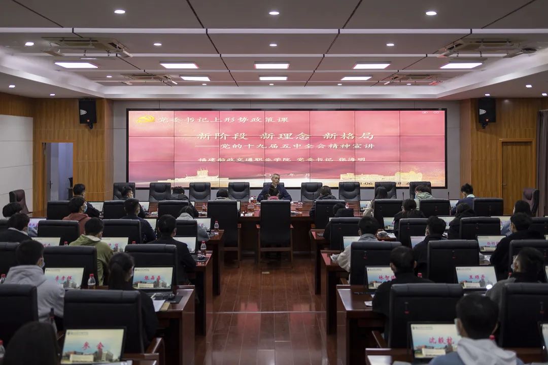 張海明書記以《新階段 新理念 新格局》為題,圍繞黨的十九屆五中全會(huì)的核心要義,決勝全面建成小康社會(huì)取得的決定性成就,構(gòu)建新發(fā)展格局的戰(zhàn)略構(gòu)想和重要著力點(diǎn),以及與學(xué)校師生密切相關(guān)的建設(shè)教育強(qiáng)國(guó)、文化強(qiáng)國(guó)、人才強(qiáng)國(guó)、體育強(qiáng)國(guó)、健康中國(guó),辦好人民滿意的教育,培養(yǎng)德技并修一專多能新時(shí)代船政人的美好向往等方面對(duì)十九屆五中全會(huì)精神進(jìn)行了系統(tǒng)講解和生動(dòng)闡釋。