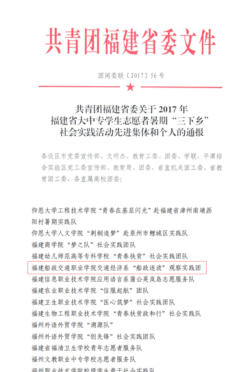 2017年福建省大中專學生志愿者暑期“三下鄉(xiāng)”社會實踐活動優(yōu)秀團隊